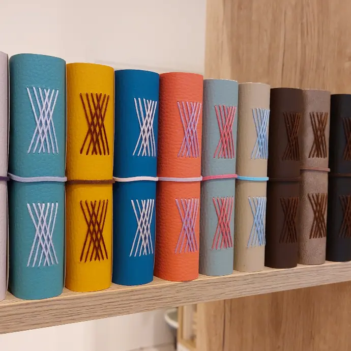 • Functional Art: Hand-bound agendas and journals featuring Italian eco-leather and quirky, artistic papers.